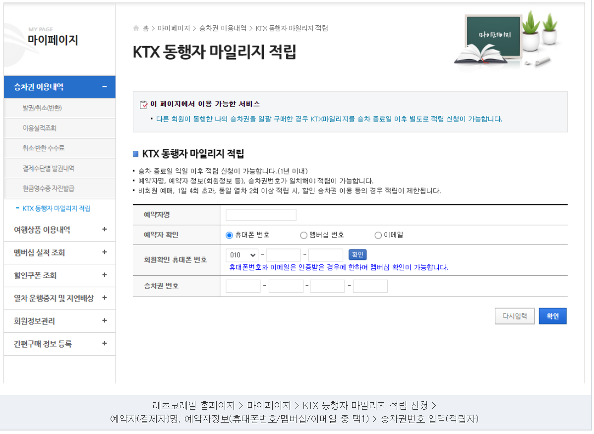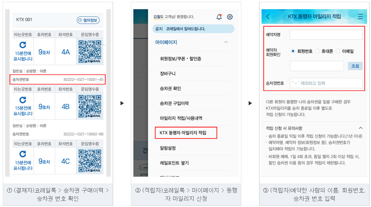 - 적립자: 마이페이지 - 승차권 이용내역 - KTX 동행자 마일리지 적립 - 예약자 정보와 승차권 번호 입력