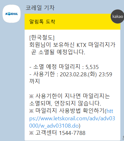 오늘 아침 코레일에서 마일리지가 소멸된다고 카톡이 왔네요. KTX 마일리지의 존재가 있는지도 몰랐던 저 ㅎㅎ