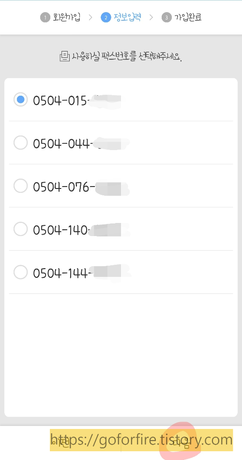 신규가입 체크 후 다음 - 내가 사용하게 될 팩스번호 선택(끝자리는 전화번호 끝자리와 동일하네요.)